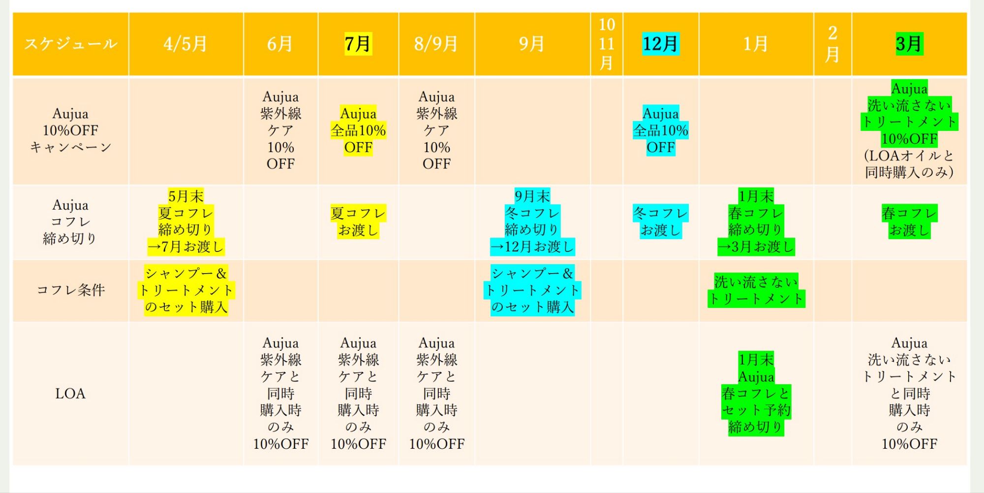 ぜひこちらの年間イベントスケジュールからAujuaの購入時期の検討にお役立てください。
